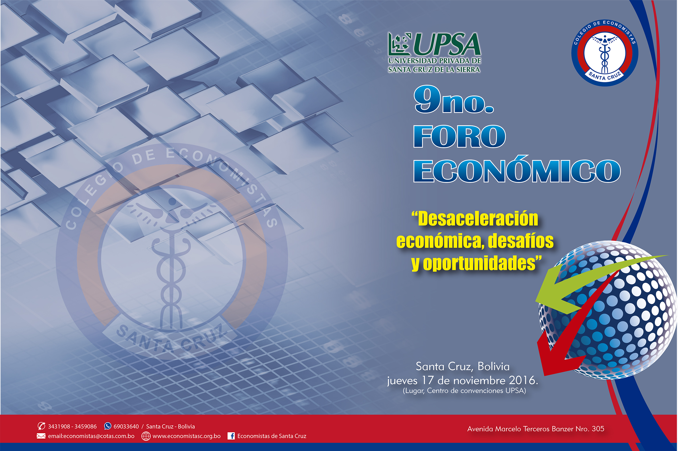La novena versión del Foro Económico que organizan el Colegio de Economistas de Santa y la UPSA tendrá lugar el 17 de noviembre, en el Centro de Convenciones del Campus, con disertaciones relacionadas a la “Desaceleración económica: desafíos y oportunidades”.