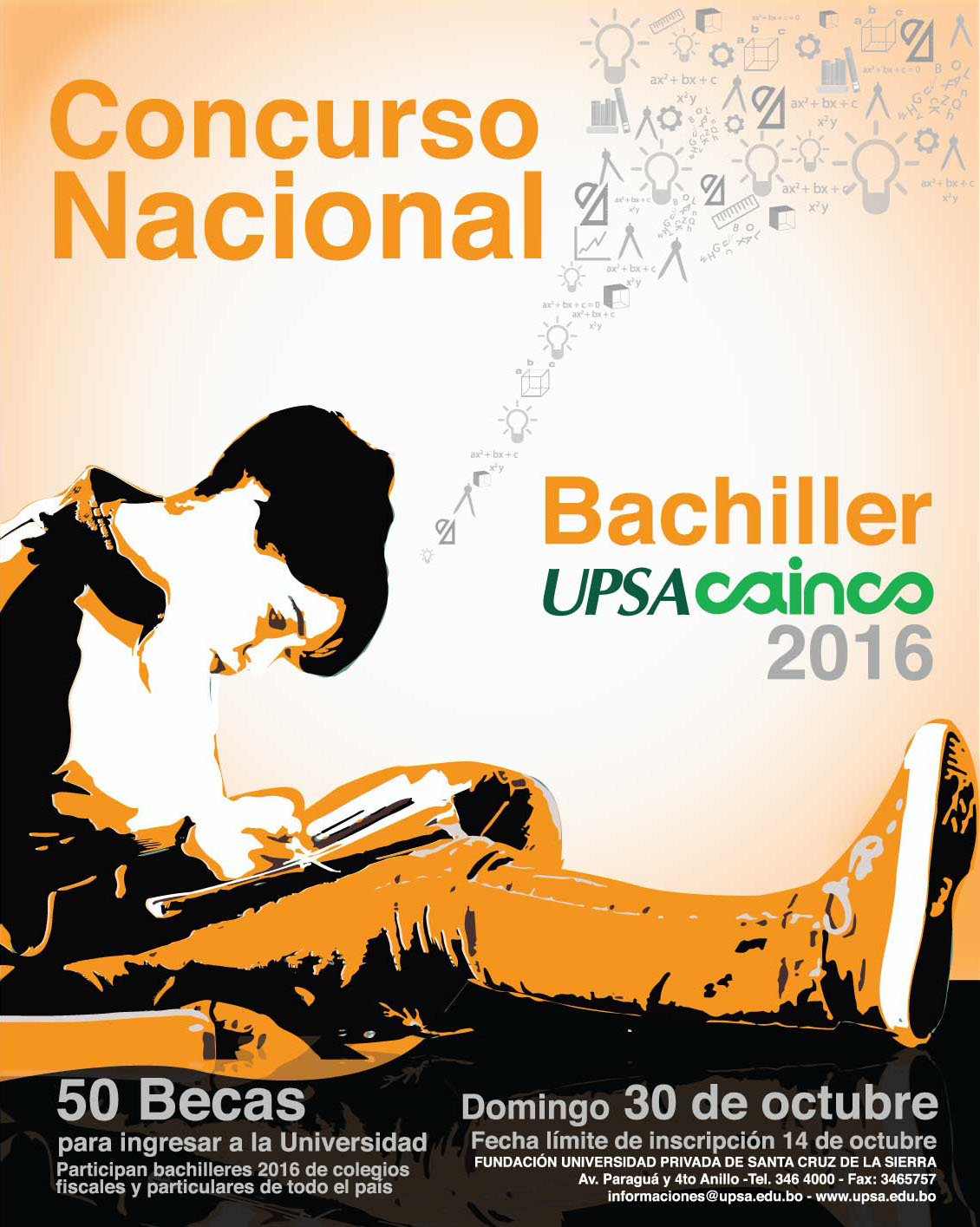 La UPSA y la Cámara de Industria, Comercio, Servicios y Turismo de Santa Cruz (Cainco) convocan al Concurso Nacional Bachiller UPSA-Cainco, que se realizará el domingo 30 de octubre en el coliseo del Campus, ubicado en la avenida Paraguá y 4º anillo.